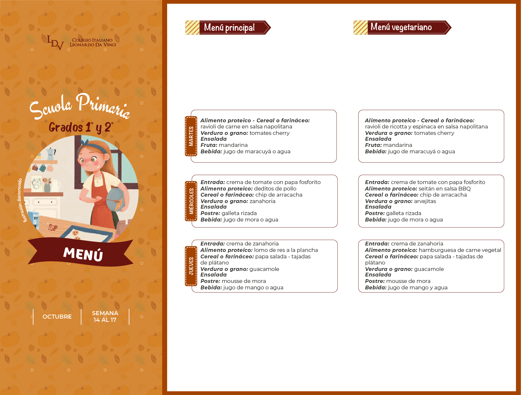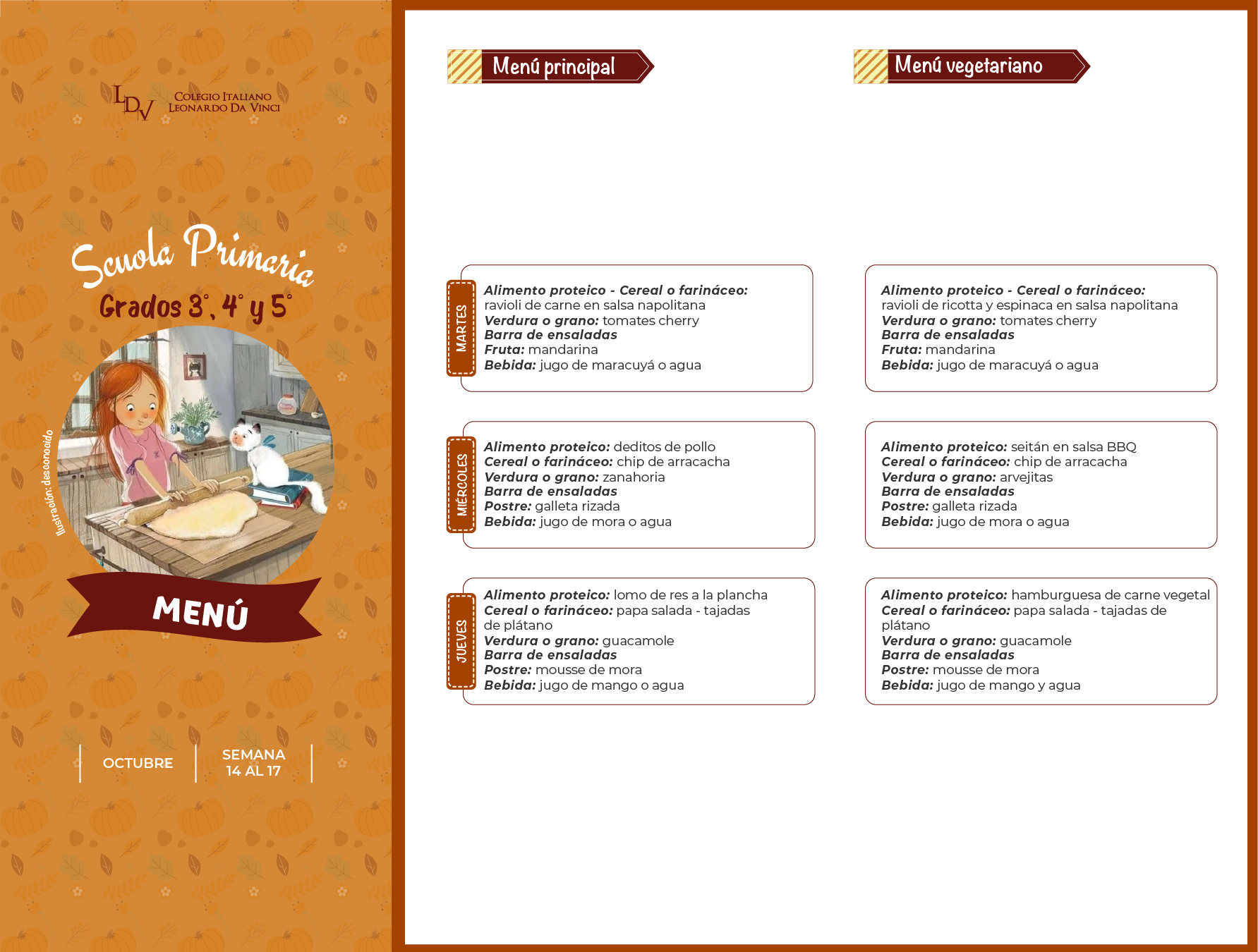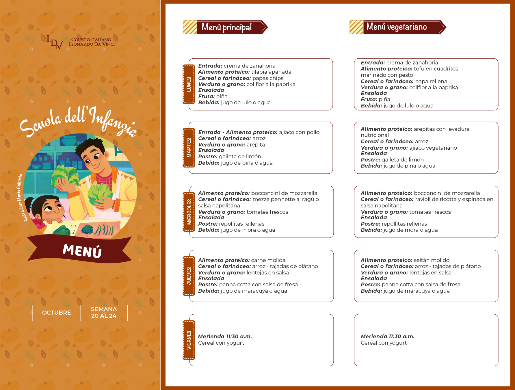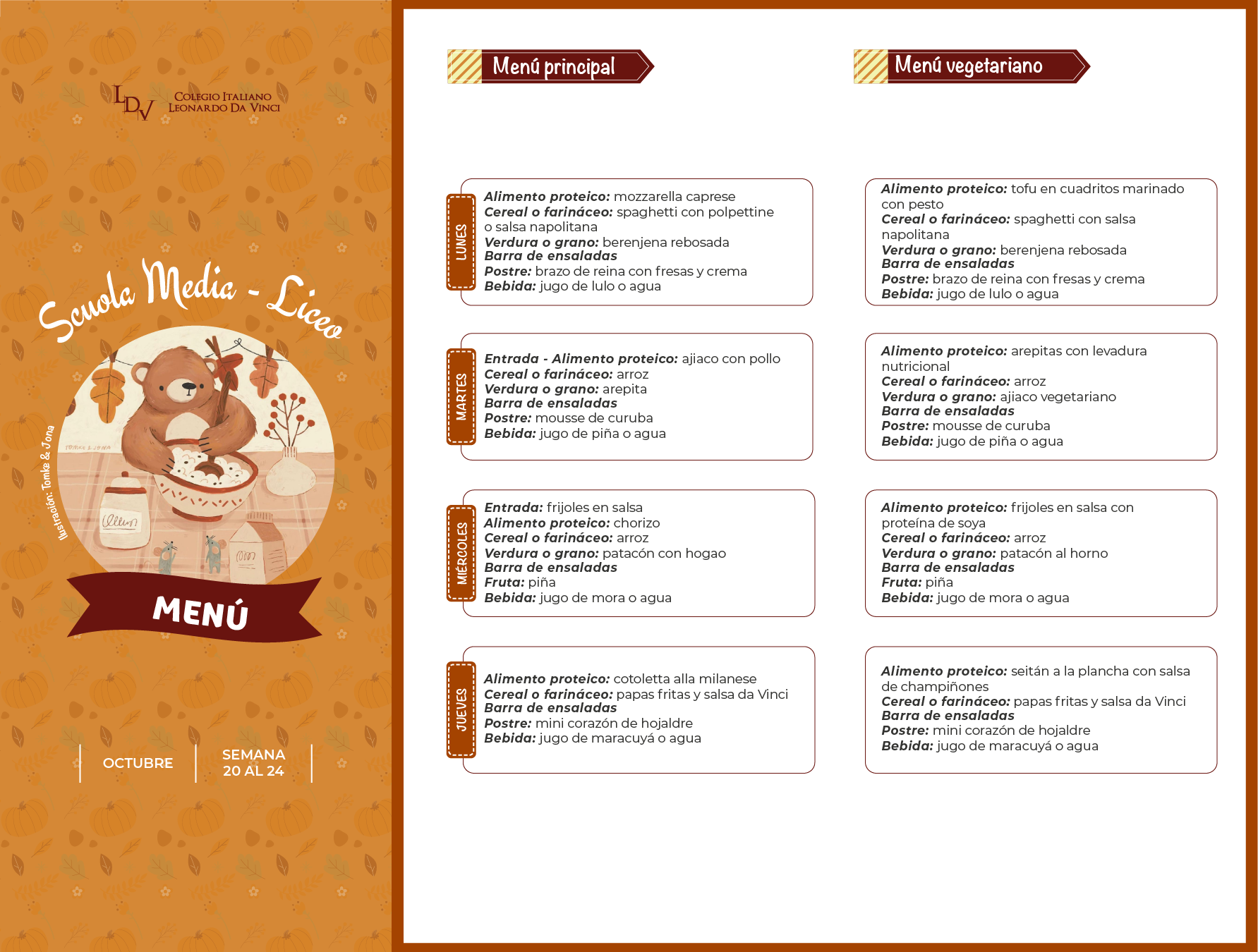 Servicio de Alimentación: Menú Semanal Descargue la carta de alimentos, publicada semanalmente para cada nivel educativo. Scuola dell'Infanzia MENÚ Primaria MENÚ 1° y 2° MENÚ 3°, 4° y 5° Media y Liceo MENÚ