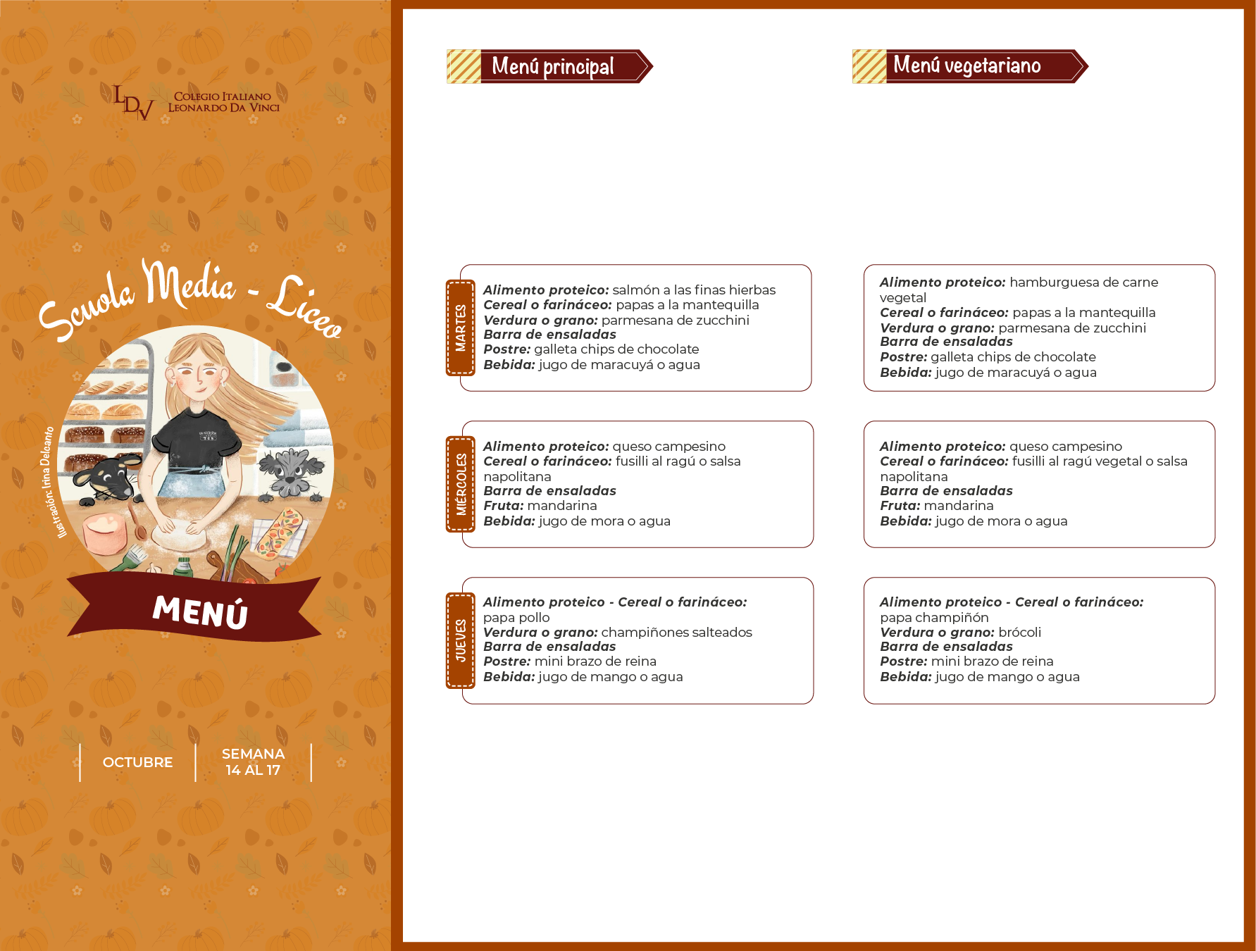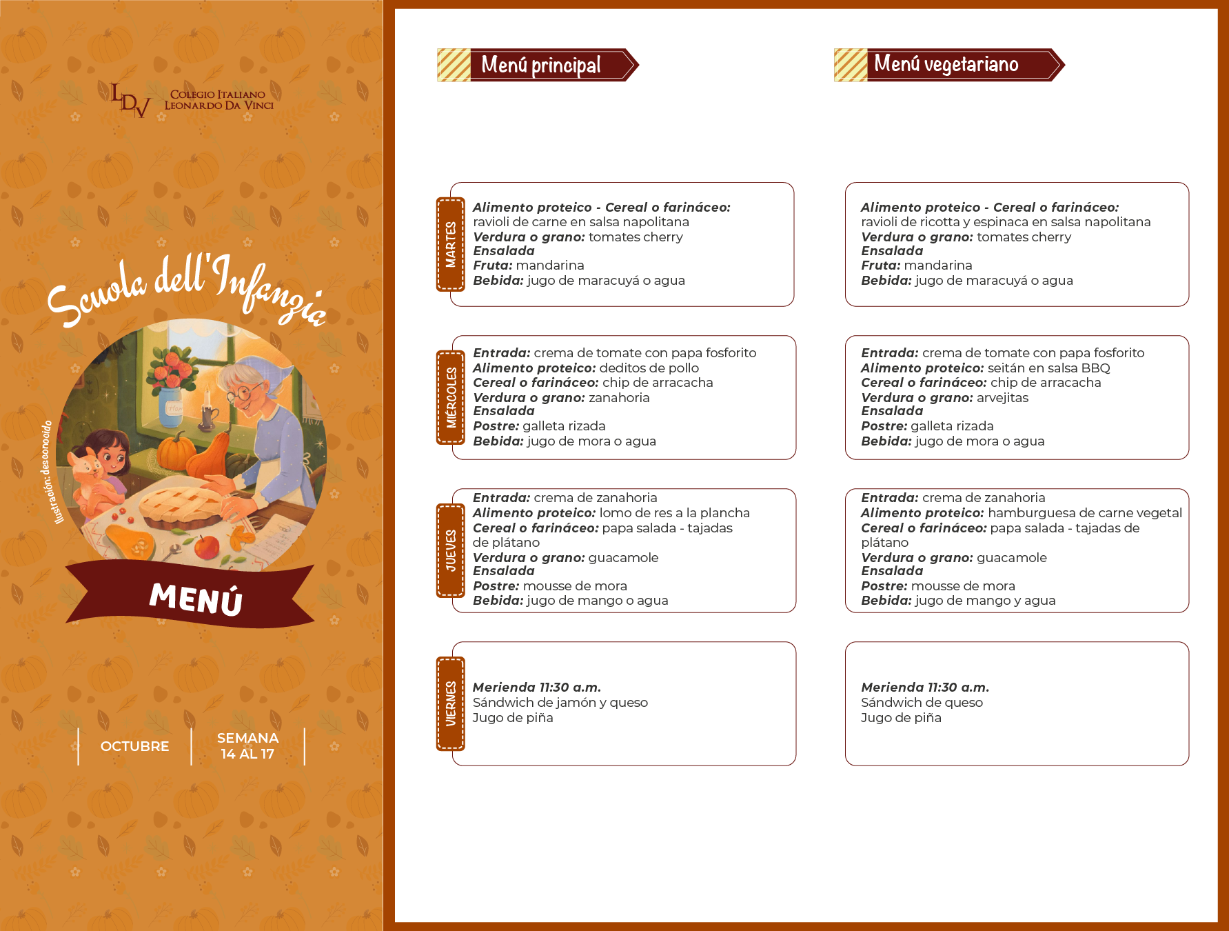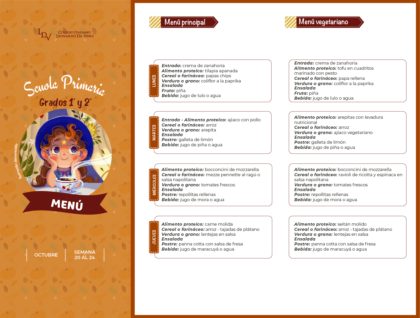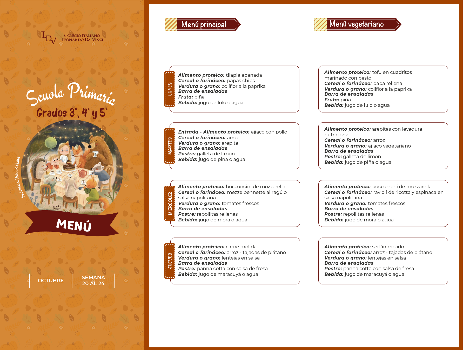 Servicio de Alimentación: Menú Semanal Descargue la carta de alimentos, publicada semanalmente para cada nivel educativo. Scuola dell'Infanzia MENÚ Primaria MENÚ 1° y 2° MENÚ 3°, 4° y 5° Media y Liceo MENÚ